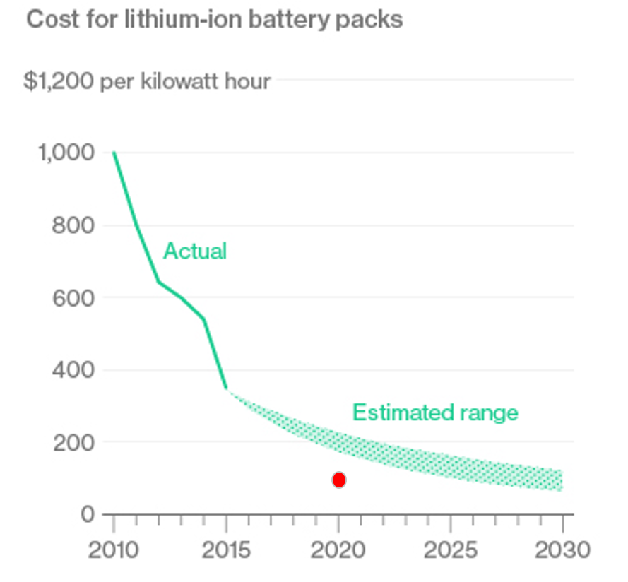 Battery price costs and predictions from Bloomberg New Energy Finance (2016 prices and Tesla’s 2020 price expectation are already below the estimated range)