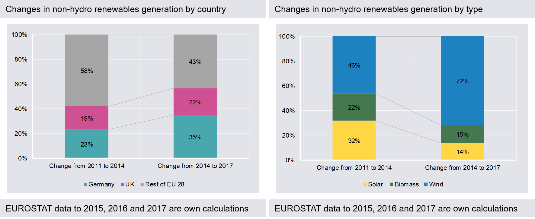 - Together Germany and the UK contributed 57% of the EU’s wind, solar and biomass growth from 2014 to 2017. Many other countries have seen anemic or even zero growth in this period.