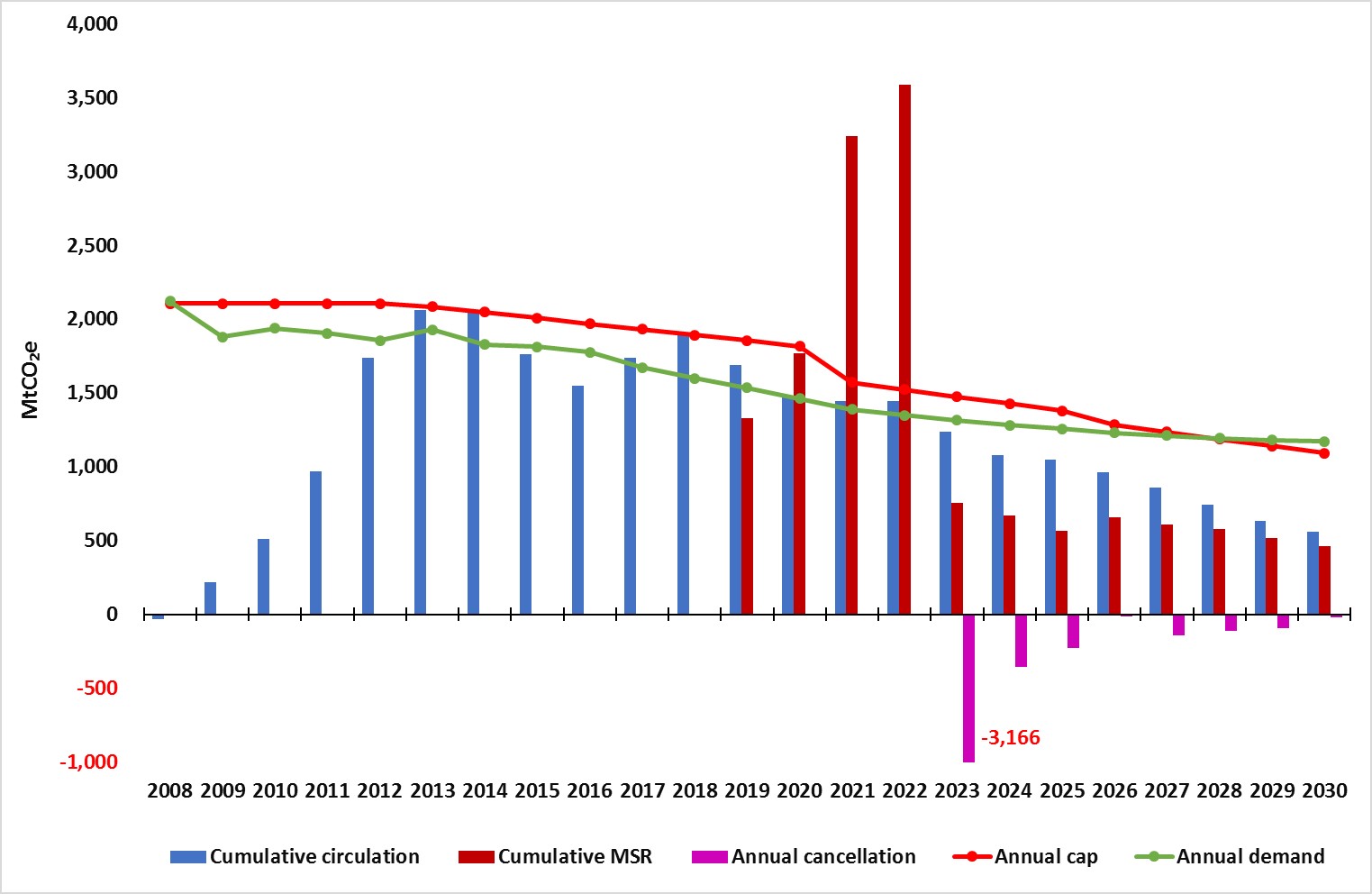 Reforms leave the ETS with a continuing enormous surplus (blue bars)